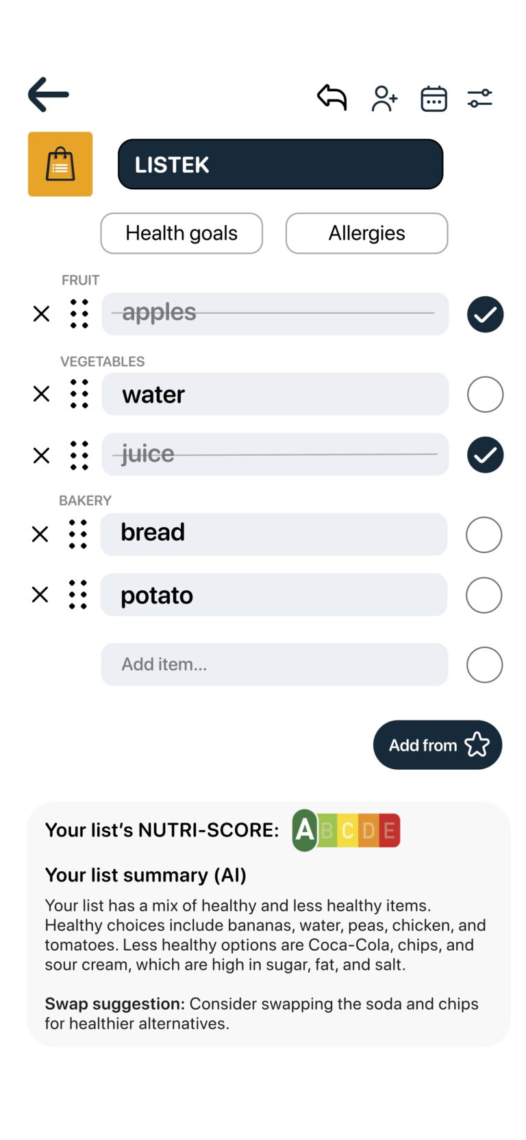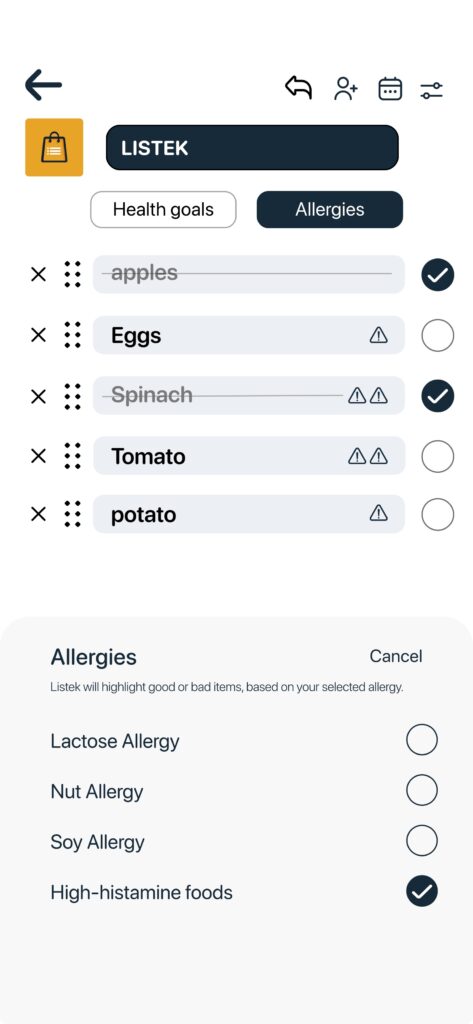 Master Your Allergy. Set your health goals and mark allergies or intolerances. Listek highlights your list based on your preferences—helping you stay aligned with what works for your body.